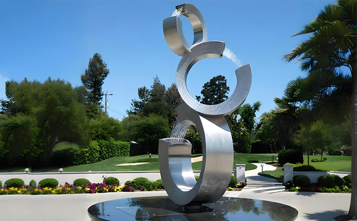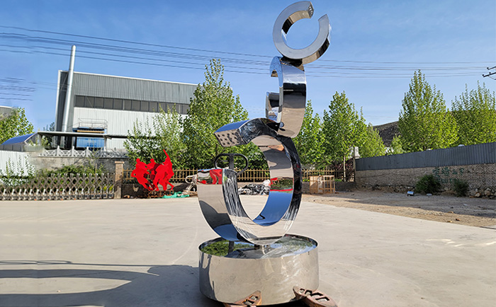 不銹鋼材質(zhì)賦予了雕塑現(xiàn)代感與時尚氣息,其光滑的表面能完美地反射周圍的環(huán)境與光影,當(dāng)噴泉開啟,水流與光影相互交織,在不同的時段、不同的天氣條件下,呈現(xiàn)出千變?nèi)f化的視覺效果。白天,陽光灑在水面與雕塑上,閃耀著金色的光芒;夜晚,配合精心設(shè)計的燈光,噴泉雕塑又成為夜空中最璀璨的存在,為城市的夜景增添了一份浪漫與神秘。